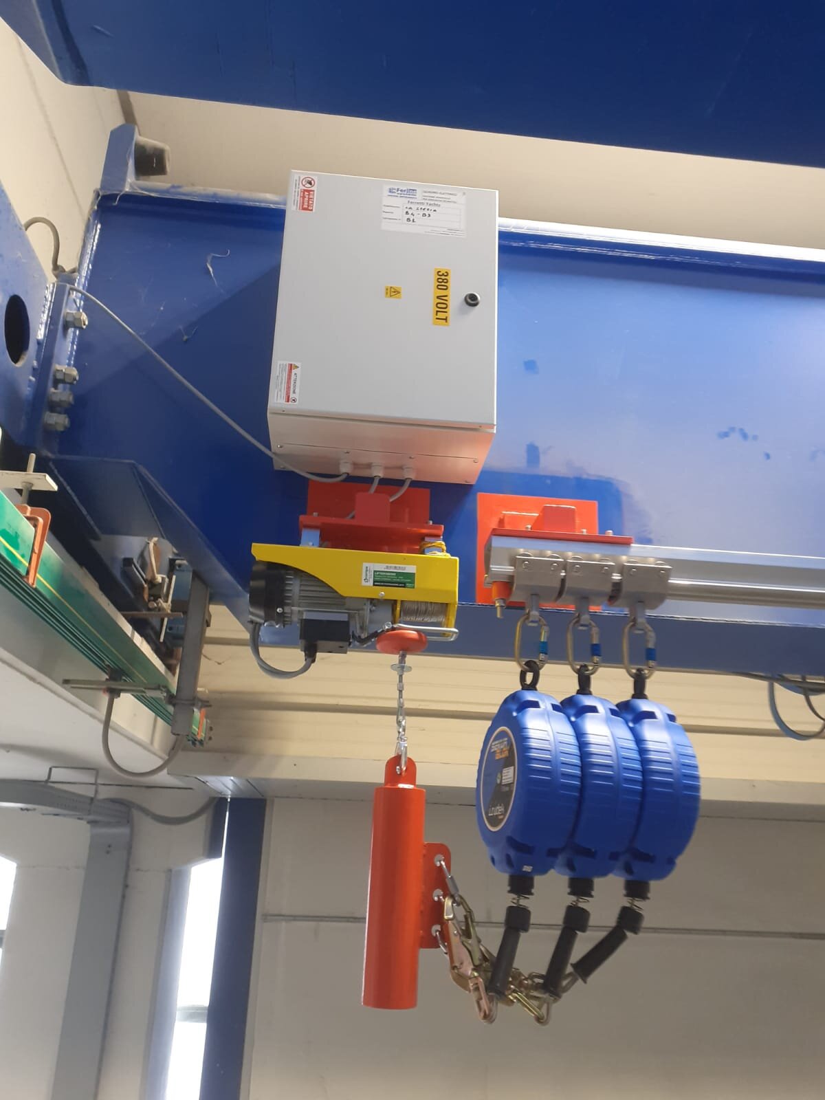 Il Winch Su e Giù è un sistema che permette di recuperare i moschettoni dei dispositivi retrattili ancorati a una linea vita a binario in quota. Esso è composto da un paranco azionabile dal basso mediante un radiocomando e da un contrappeso in grado di ospitare fino a 4 moschettoni contemporaneamente.